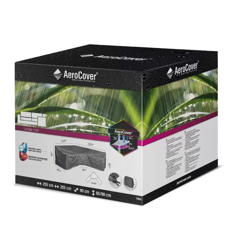 Loungesethoes voor hoeksets van AeroCover. Ademende loungesethoes voor L-vorm loungeset met grote hoek of trapeze hoek en hoge rug 255x255x90x65/90. AeroCovers zijn ademend, waterbestendig, reduceren condensvorming en gaan schimmelvorming tegen. De stof heeft een hoge kleurechtheid door de door en door geverfde vezels. Een Aerocover hoes verlengt de levensduur van uw tuinmeubelen. AeroCovers zijn vervaardigd van sterk en lichtgewicht ripstop polyester. Ze zijn makkelijk hanteerbaar en nemen weinig ruimte in wanneer niet in gebruik. De afdekhoes is voorzien van rijgkoord met 2 stoppers voor een goede pasvorm. Inclusief handige opbergtas. AeroCover stoffen zijn 100% waterdicht, de naden zijn, net als elke ander hoes, spatwaterdicht.