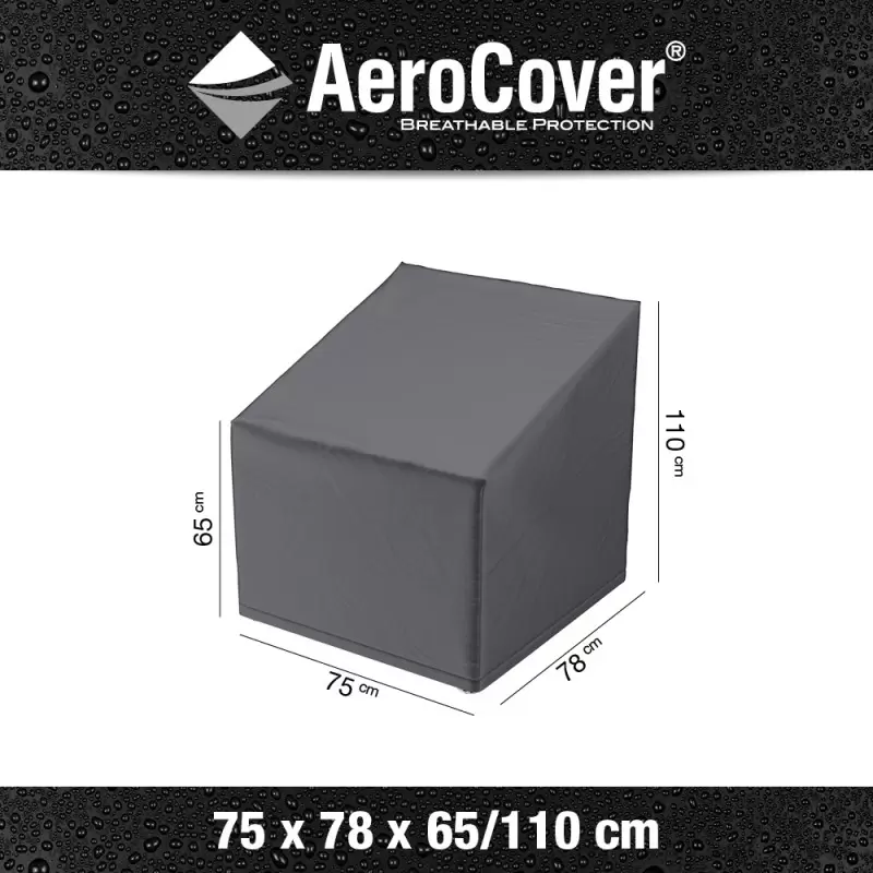 Loungestoelhoes van AeroCover. Ademende loungesethoes voor lounge stoel 75x78cm met extra hoge rug tot 110 cm. AeroCovers zijn ademend, waterbestendig, reduceren condensvorming en gaan schimmelvorming tegen. De stof heeft een hoge kleurechtheid door de door en door geverfde vezels.