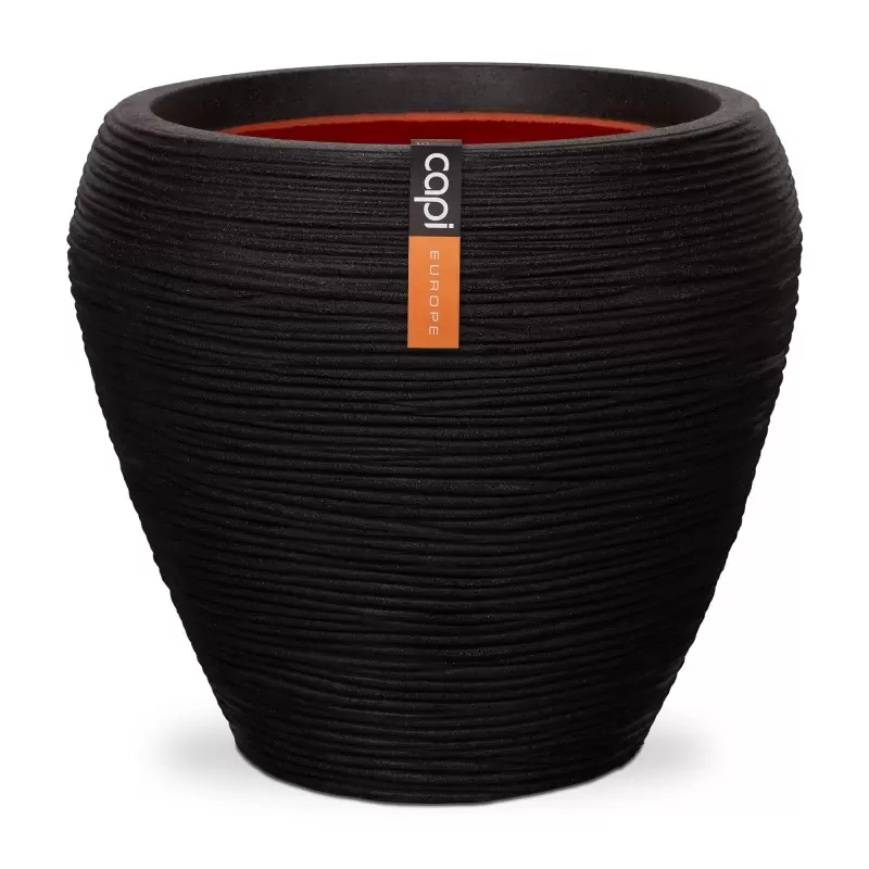 Deze Vaas taps rib ii d42h38 zwart van de Capi Tutch serie is gemaakt van kunststof, deze potten zijn herkenbaar door de oranje binnenzijde. De binnenzijde is een isolatie laag zodat de plant in de winter beschermd is tegen vorst en in de zomer tegen de warmte. Capi Europe geeft op deze pot een garantie van 10 jaar. Deze pot is zowel voor binnen als voor buiten geschikt. Wanneer je deze pot buiten gaat gebruiken is het verstandig om het drainage gat te verwijderen, dan kan de pot het overtollige water afvoeren. Deze pot is UV en vorst bestendig.