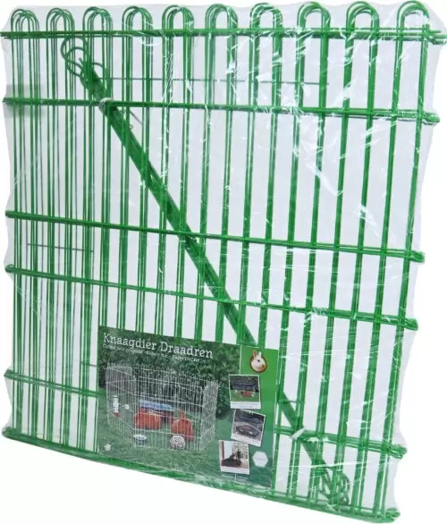 Voor lichaamsbeweging en speelplezier. De metalen konijnenloopren kan zowel op tegels als op gras geplaatst worden. De ren op de tegels plaatsen is goed voor de nagels zodat deze kunnen slijten aan de ruwe ondergrond. Op het gazon kan het dier lekker van het gras smullen. De ren kan bedekt worden met een speciaal afdeknet en of bodemhoes. Afdeknetten en bodemhoezen zijn los verkrijgbaar. Laat uw konijn regelmatig in de ren, zodat het dier voldoende bewegingsvrijheid heeft. Om het konijn op zijn gemak rond te laten lopen is het plaatsen van een huisje om te schuilen aan te bevelen (huisje is niet inbegrepen). De ren bestaat uit 6 panelen met een afmeting van: 67×60 cm per paneel (hxb), 1 paneel beschikt over een deur.