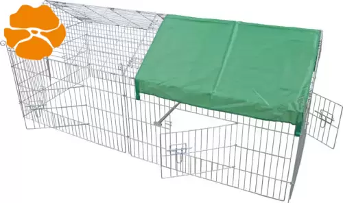 De Boon verzinkte draadren met puntdak en zonnedoek is met zijn lengte en breedte van 180 bij 75 cm erg ruim en voorzien van diverse deuren. Het puntdak geeft een huiselijk idee en kan zowel op het gras als op een harde ondergrond worden geplaatst. Uw kip, konijn en/of cavia kan hier naar hartenlust bewegen en genieten van de buitenlucht, tevens is deze uitvoering voorzien van een zonnedoek die bij zonnige dagen kan zorgen voor een aangename schaduwplaats. Afmetingen lxbxh: 180x75x75 cm.