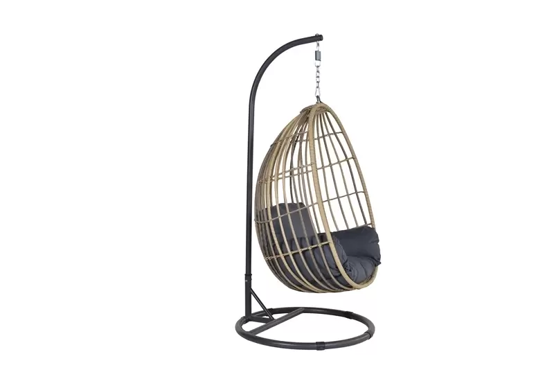 Comfortabel design Panama Swing Egg hangstoel met stevig stalen frame, voorzien van een poedercoating in de trendkleur royal grey. Het ei is van aluminium met daaromheen earl grey vlechtwerkdraad. Deze eyecatcher is voorzien van een heerlijk dik comfortabel loungekussen in de kleur earl grey. Het design ei zelf is 88 cm breed en 128 cm hoog. Met twee jaar productgarantie.