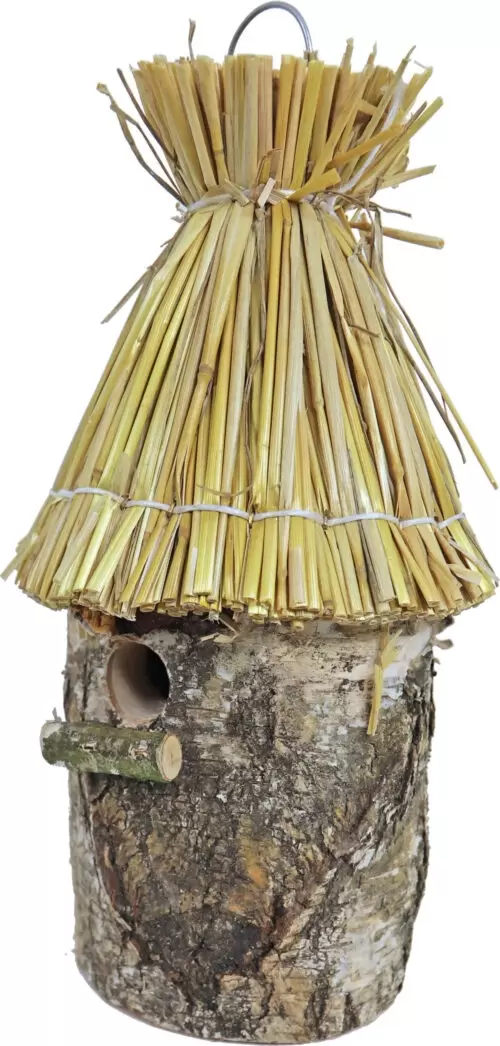 Mezenkast berken met stro dak hangbaar, puur natuurlijke look. Dit leuke vogelhuisje is gemaakt van berkenhout en heeft een stro dak. Het huisje kan door middel van een metalen haak opgehangen worden. Leuk als decoratie in elke tuin. In- en uitvliegopening: Ć 30 mm.
