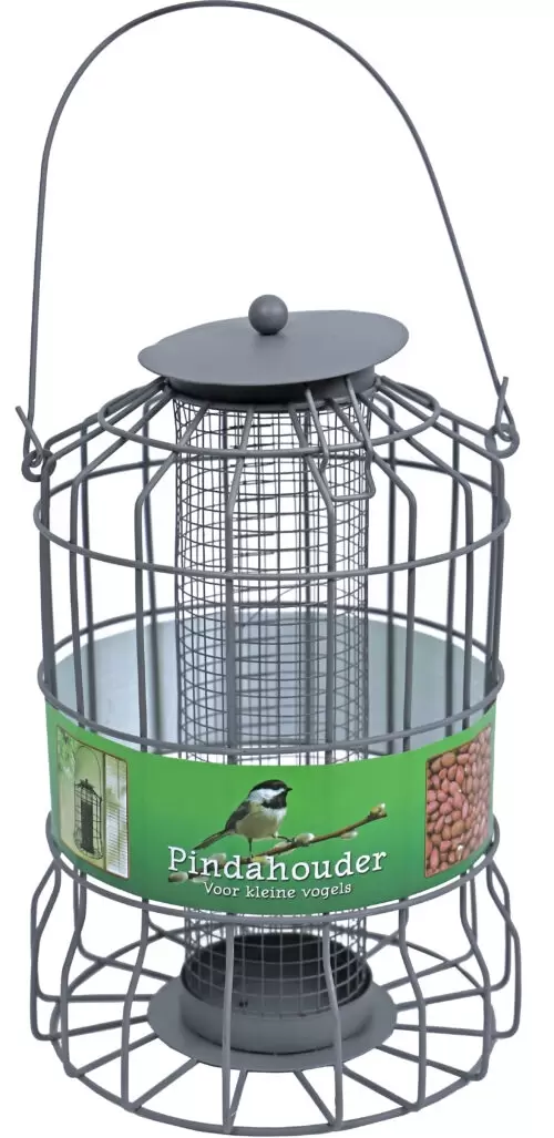 Metalen pindahouder grijs voor kleine vogels is een voersilo waar vogelpinda’s in kunnen voor buitenvogels. De voersilo heeft een beschermende draadbol om zich heen en biedt daarmee een veilige voerplek aan voor de kleine buitenvogels. Grote vogels kunnen er niet bij door de kleine mazen. De metalen pindahouder is gemakkelijk schoon te maken en het ergonomische design zorgt voor een natuurlijk houding tijdens het eten. Door deze voersilo geniet je van etende vogels in uw tuin of balkon die niet weggejaagd zullen worden door grote vogels. Afmeting: 24×17 cm.