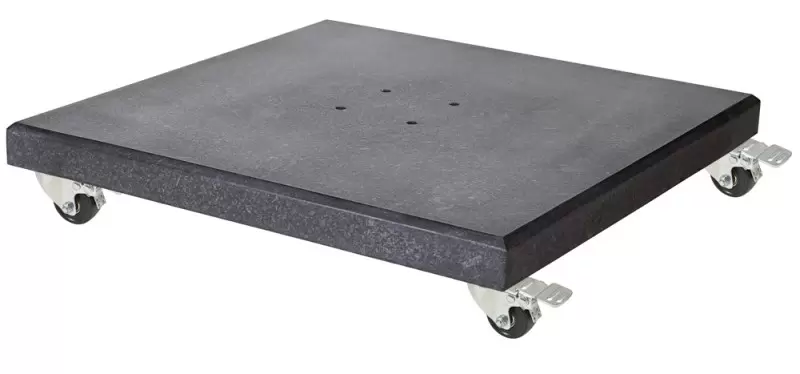 Parasolvoet voor zweefparasols Modena 90kg van Platinum. Voorzien van zwenkwielen met rem waardoor de parasolvoet makkelijk te verplaatsen is. Deze natuurstenen parasolvoet is vervaardigd van speciaal geselecteerd graniet en zwart gepolijst.Geschikt voor o.a. Platinum zweefparasols Challenger, Solarflex, Deltawing en Falcon.